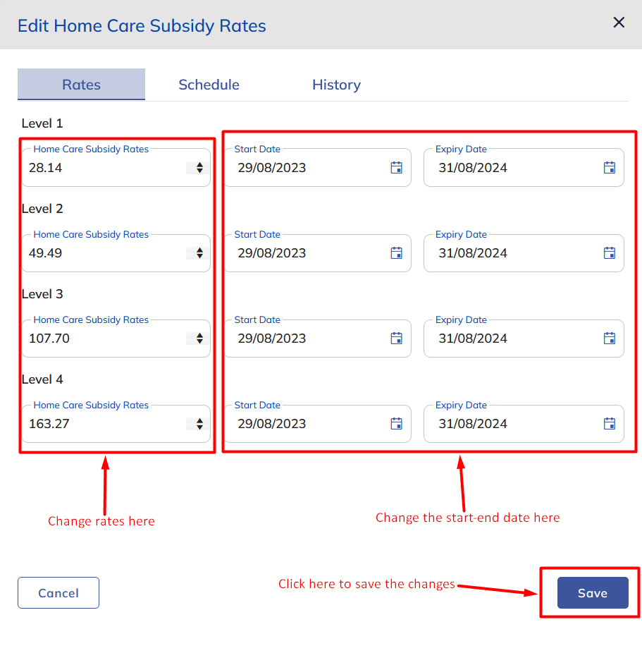 Upon clicking on the edit icon on the subsidy management screen, the user will get an edit popup screen where they can update and save the rates for daily subsidy levels and supplements. User can schedule new rates also, new rates will be updated and applicable as per the new start and expiry date set.