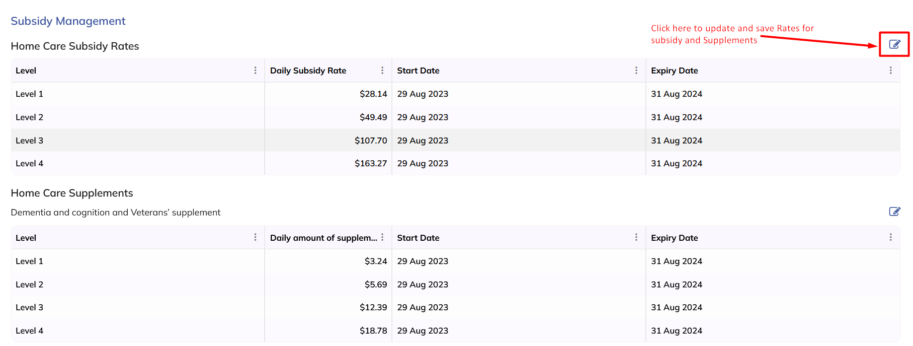 In Subsidy Management, users will be able to view and edit the daily subsidy and supplement rates for the aged care clients. As per these rates subsidy and supplements will be credited to the client on daily basis.