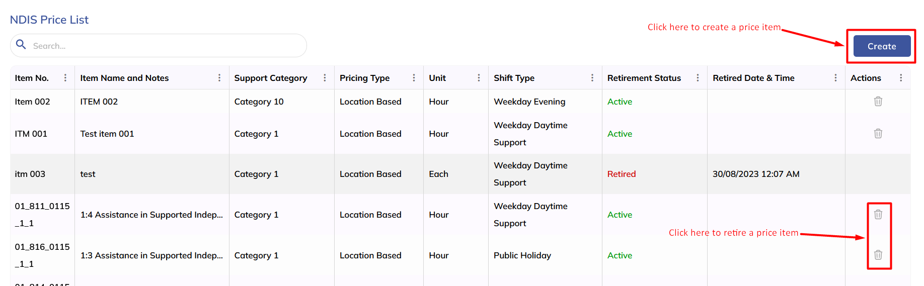 The NDIS price list is for NDIS client types. On this screen, users can create, view, and edit the price items for NDIS client types. They will also be able to retire any price item.