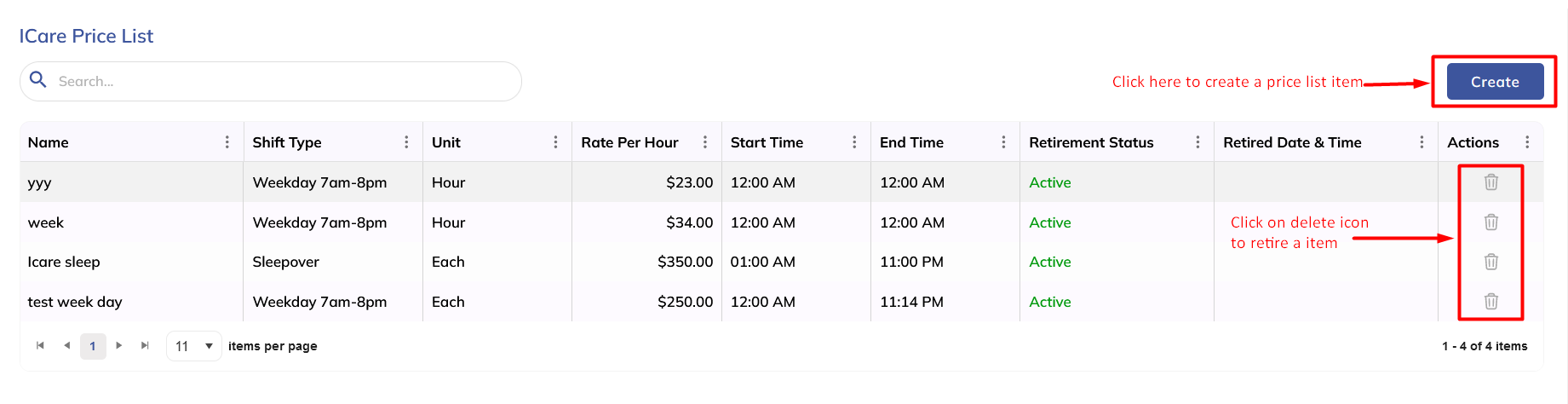 The iCare price list is for the iCare client type. In this screen, the user will be able to create, view, edit, update, and retire price list items.