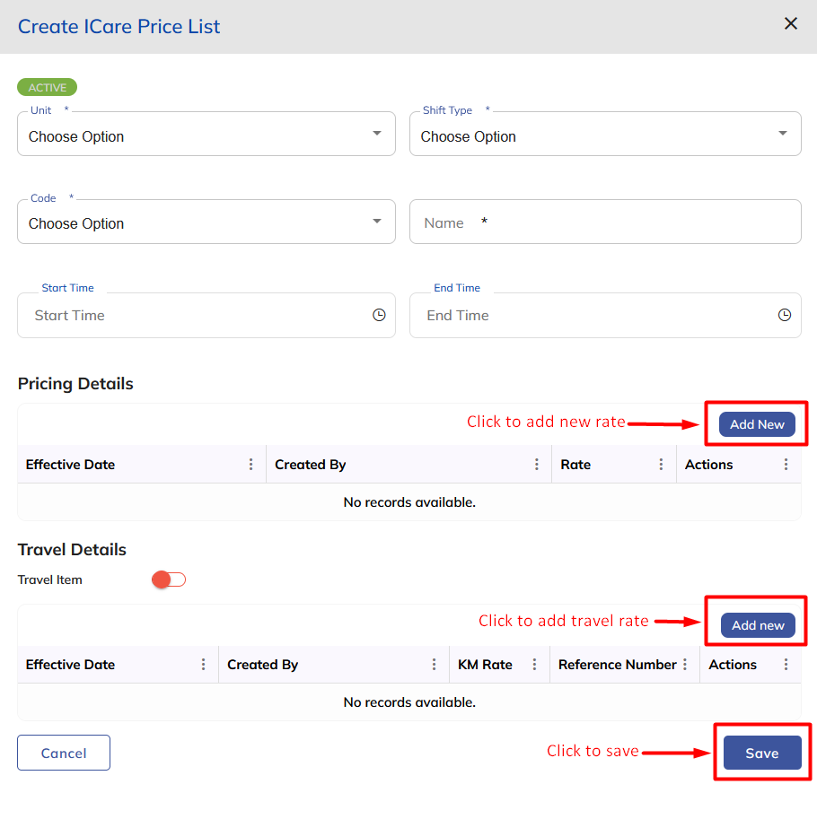 Upon clicking on the create button on the iCare price list screen, the user will get a popup window to create a price list item, and then the user has to select and fill in the mandatory fields and save.