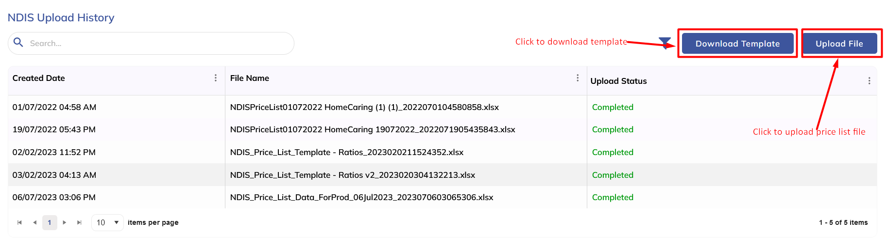 The NDIS upload history screen lists uploaded records. It is used to upload bulk price list items. Here, the user gets the option to download a template in the form of an excel sheet in which price items can be added in the given format, and then they can be uploaded from the Upload File option. Uploaded price list items will reflect on the NDIS price list screen.