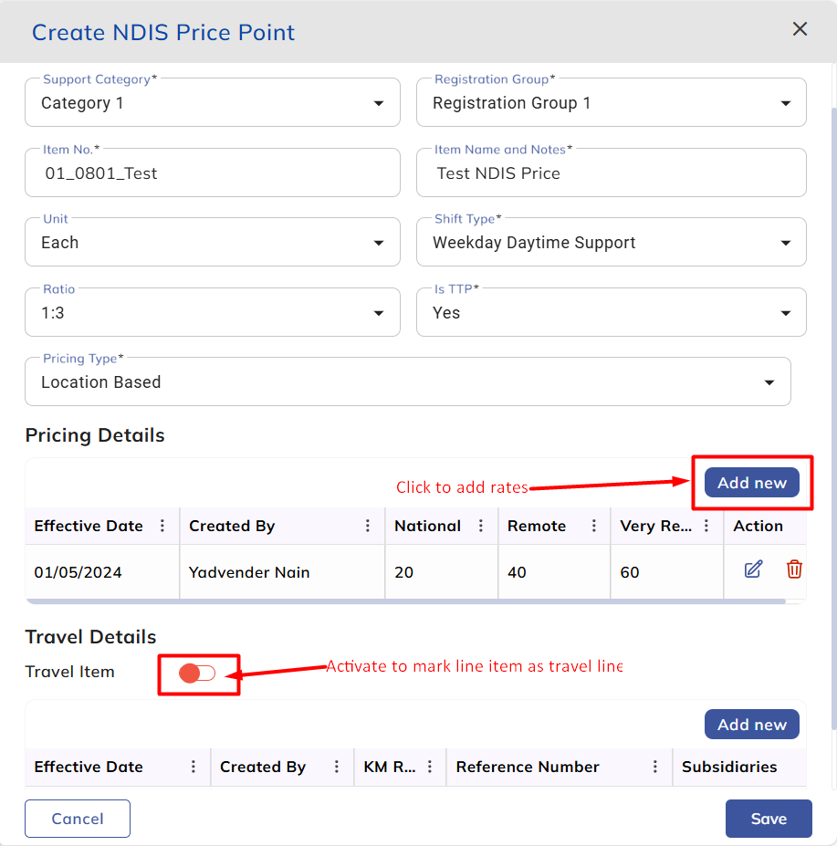 Upon clicking the "Create" button on the NDIS price list screen, the user will receive a popup window to create a price list item. From there, the user must select and fill in the mandatory fields and rates before saving. To designate any line item as a Travel Line item, simply activate the "Travel Item" toggle. This travel line item can then be linked to any other price line item for reference.