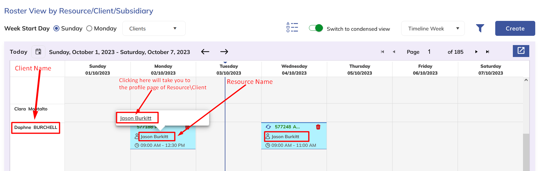 The Roster View by Resource/Client/Subsidiary has been updated to show resource names in client view and vice versa, and clicking on a name in the shift card will take you to the client/resource profile page. - Row highlighting in Shift Review\Approval screen.