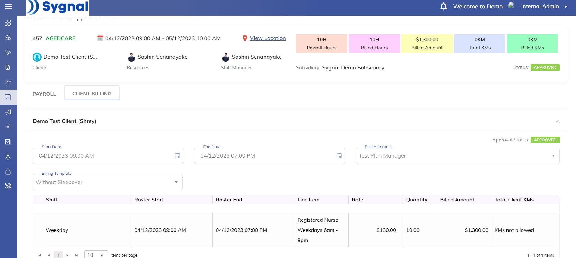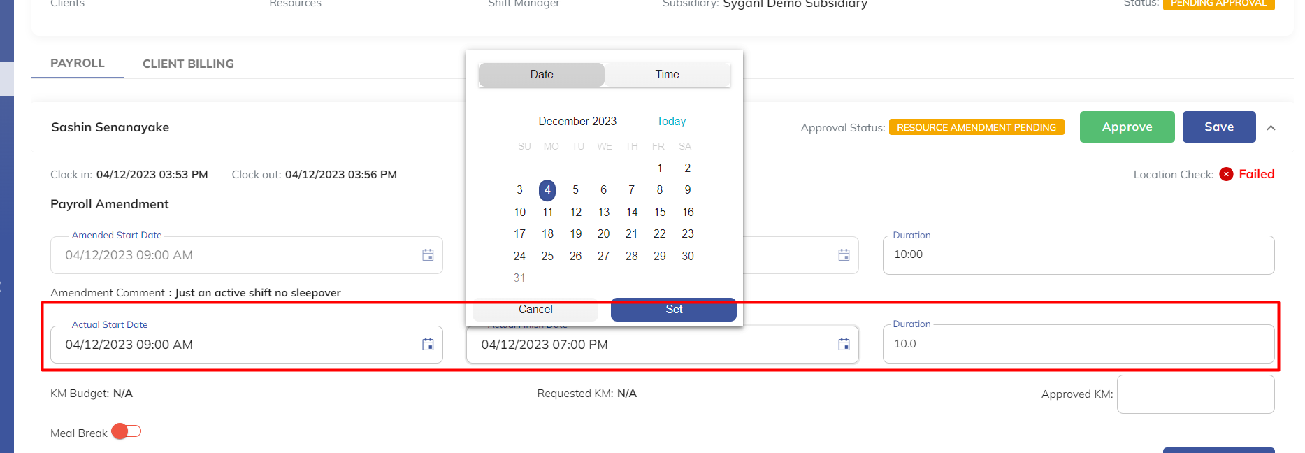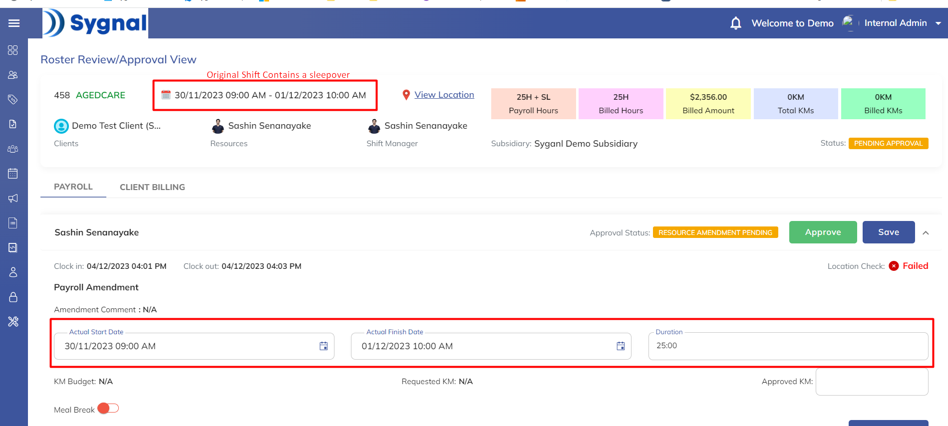 Where resource user can request the amendment from the Sygnal mobile in the clock-out process. Then the request will be available for the approver user to amend on the resource amendment & client amendment view. Upon the amendment, the resource billing and client billing amendment values will be taken to the report generation.