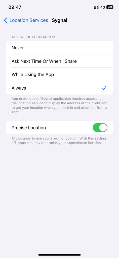 Enable Location Permission for Sygnal: Make sure that the Sygnal application has permission to access the location. Set the location permission to either 'While Using the App' or 'Always.'