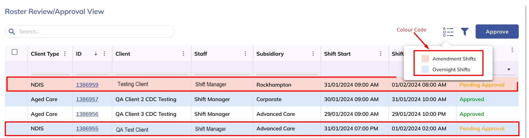 - Additionally, priority highlighting has been applied for amendment shifts; if a shift is both overnight and an amendment, it will be prominently highlighted for easy identification.