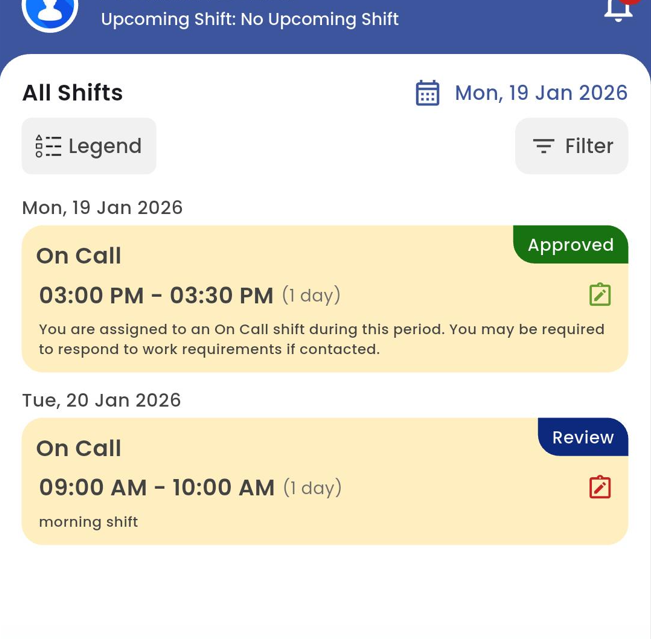 Yes. On Call shifts appear in the Shift List with a clear On Call indication.
